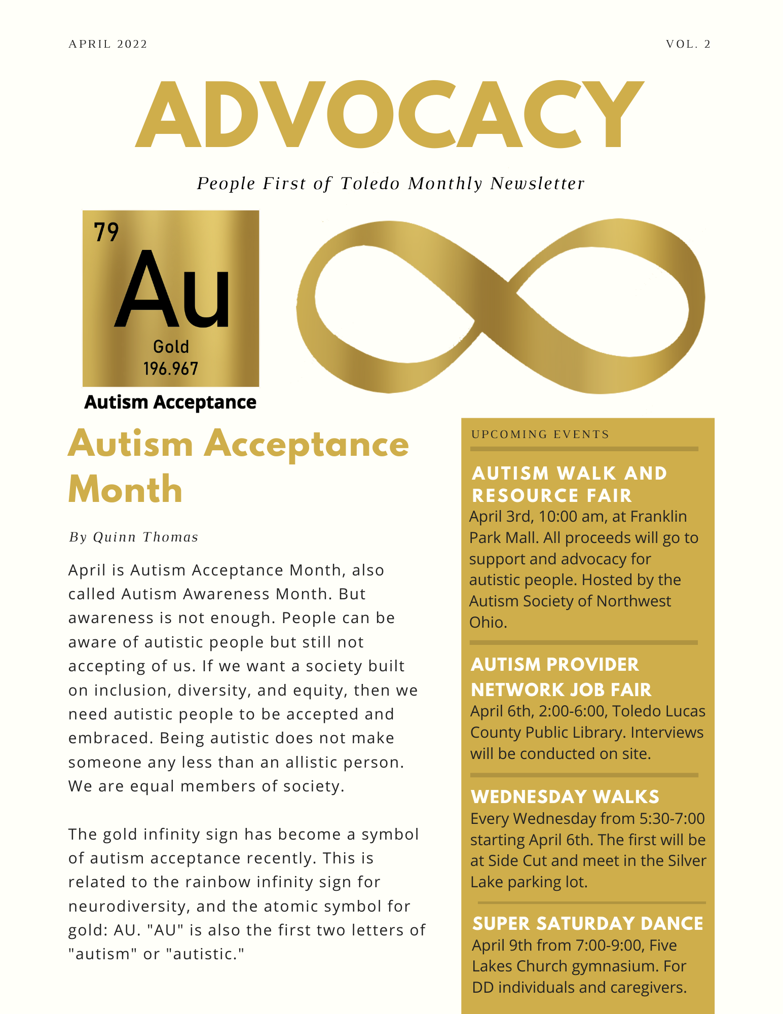 Advocacy Newsletter| May 8, 2023 Autism Acceptance Month This is People First of Toledo’s monthly advocacy newsletter. For a PDF version, click here. Sign up for emails. Previous Next Search for: Search Categories Advocacy Newsletter Blog Posts Camp Information Camp Updates Raffle