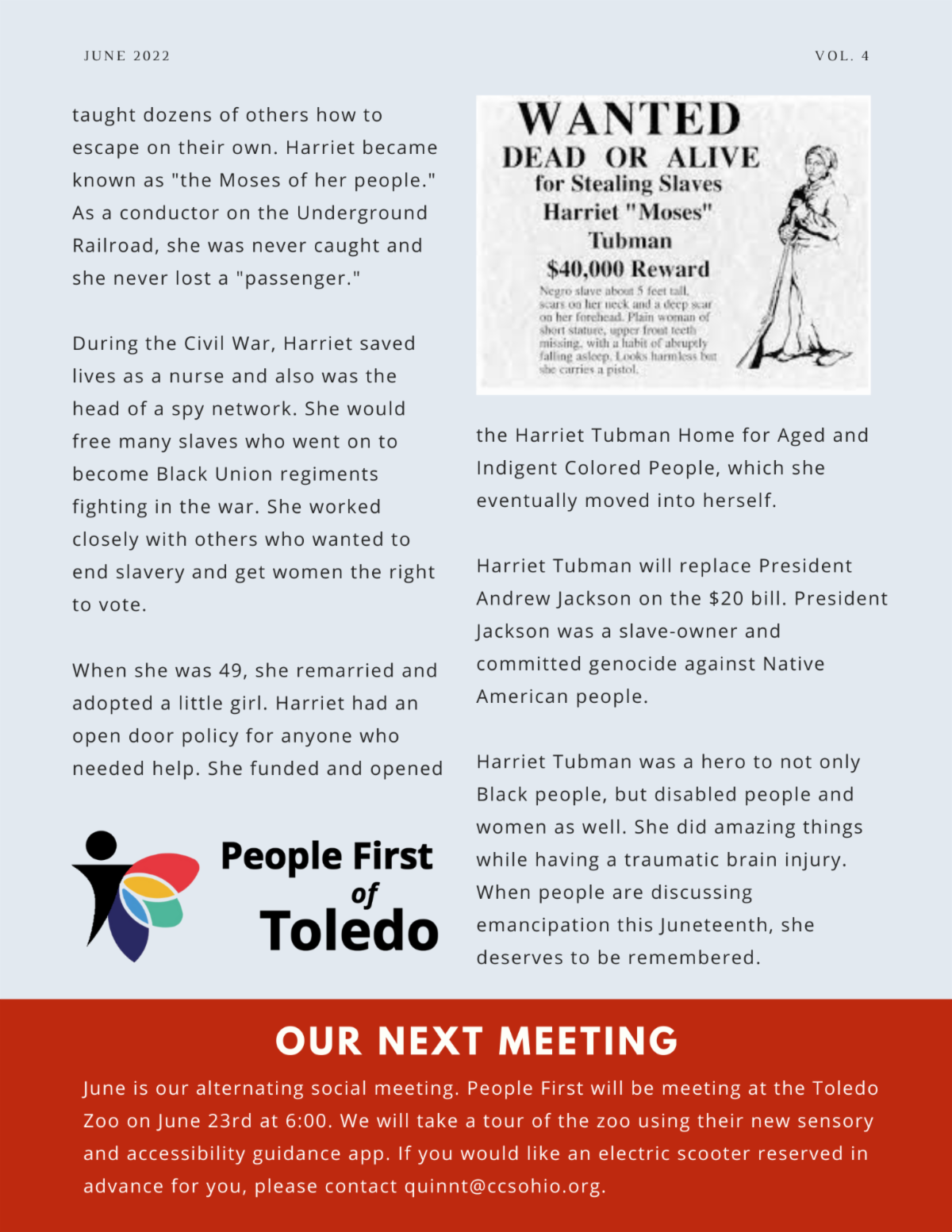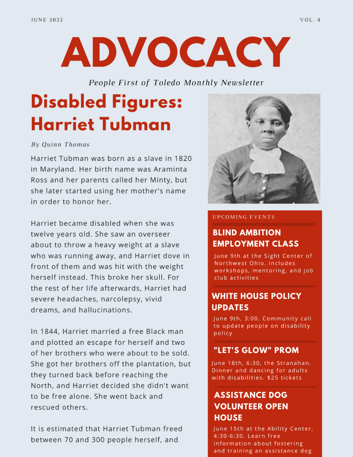 Advocacy Newsletter| May 8, 2023 Disabled Figures: Harriet Tubman This is People First of Toledo’s monthly advocacy newsletter. For a PDF version, click here. Sign up for emails. Previous Next Search for: Search Categories Advocacy Newsletter Blog Posts Camp Information Camp Updates Raffle