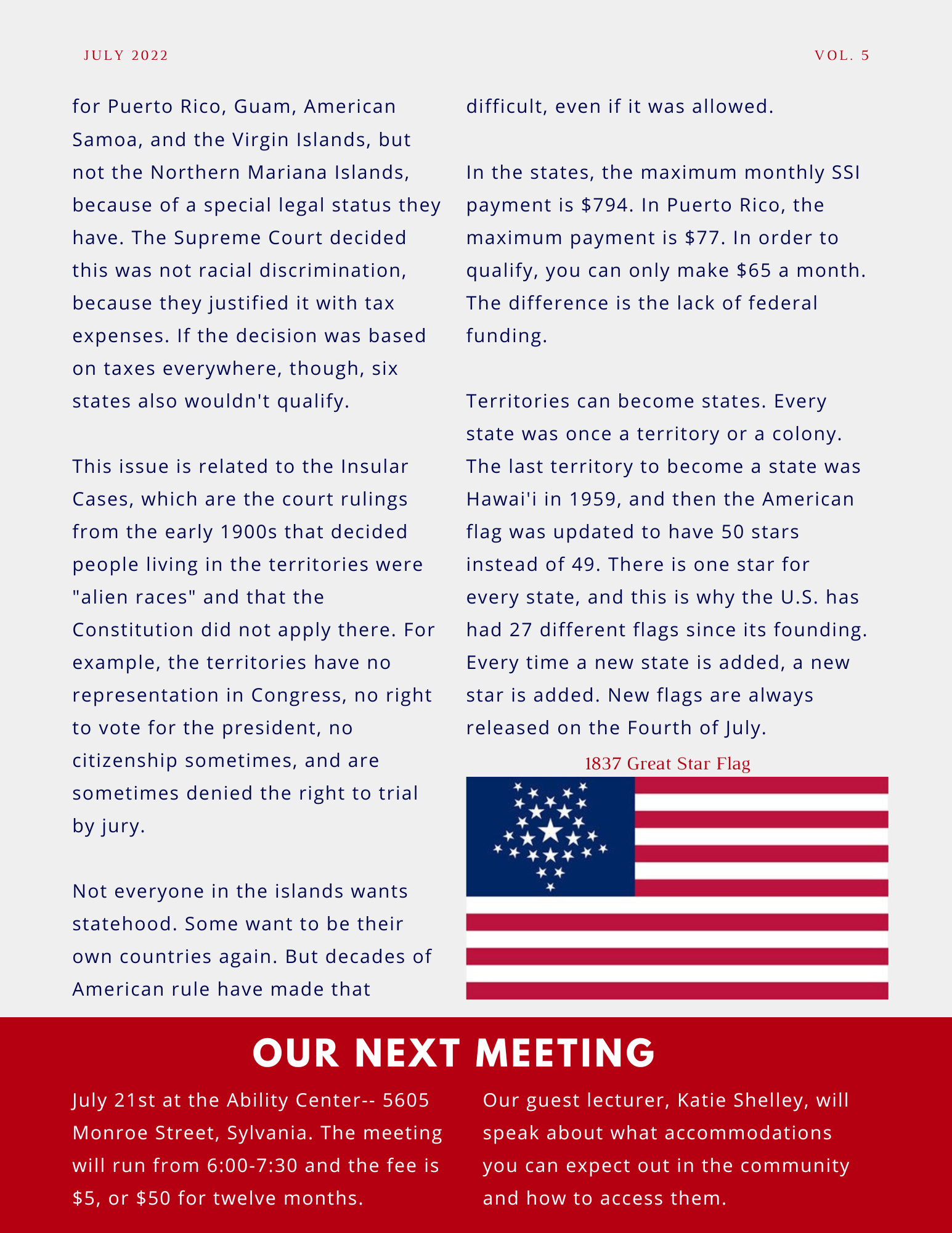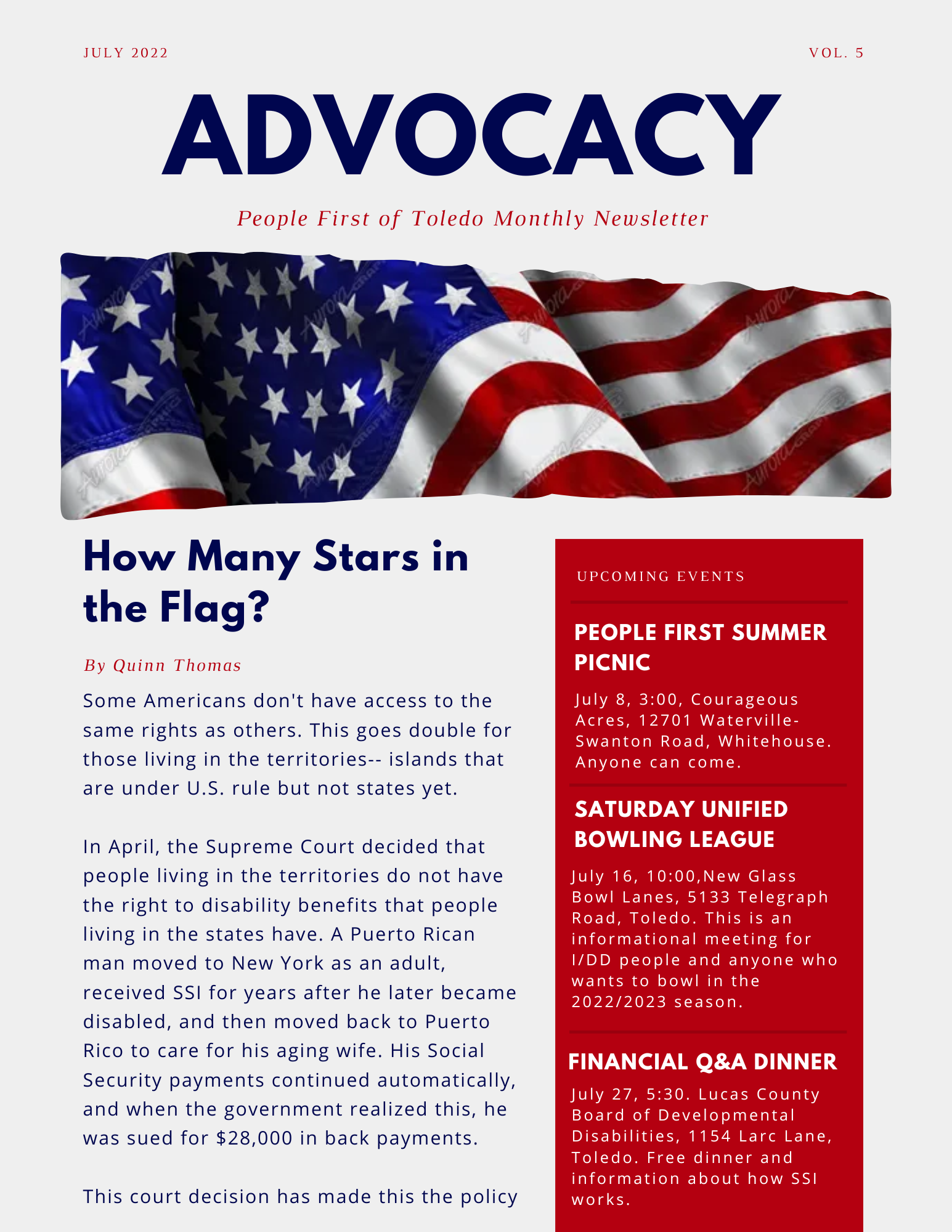 Advocacy Newsletter| May 10, 2023 How Many Stars in the Flag? This is People First of Toledo’s monthly advocacy newsletter. For a PDF version, click here. Sign up for emails. Previous Next Search for: Search Categories Advocacy Newsletter Blog Posts Camp Information Camp Updates Raffle