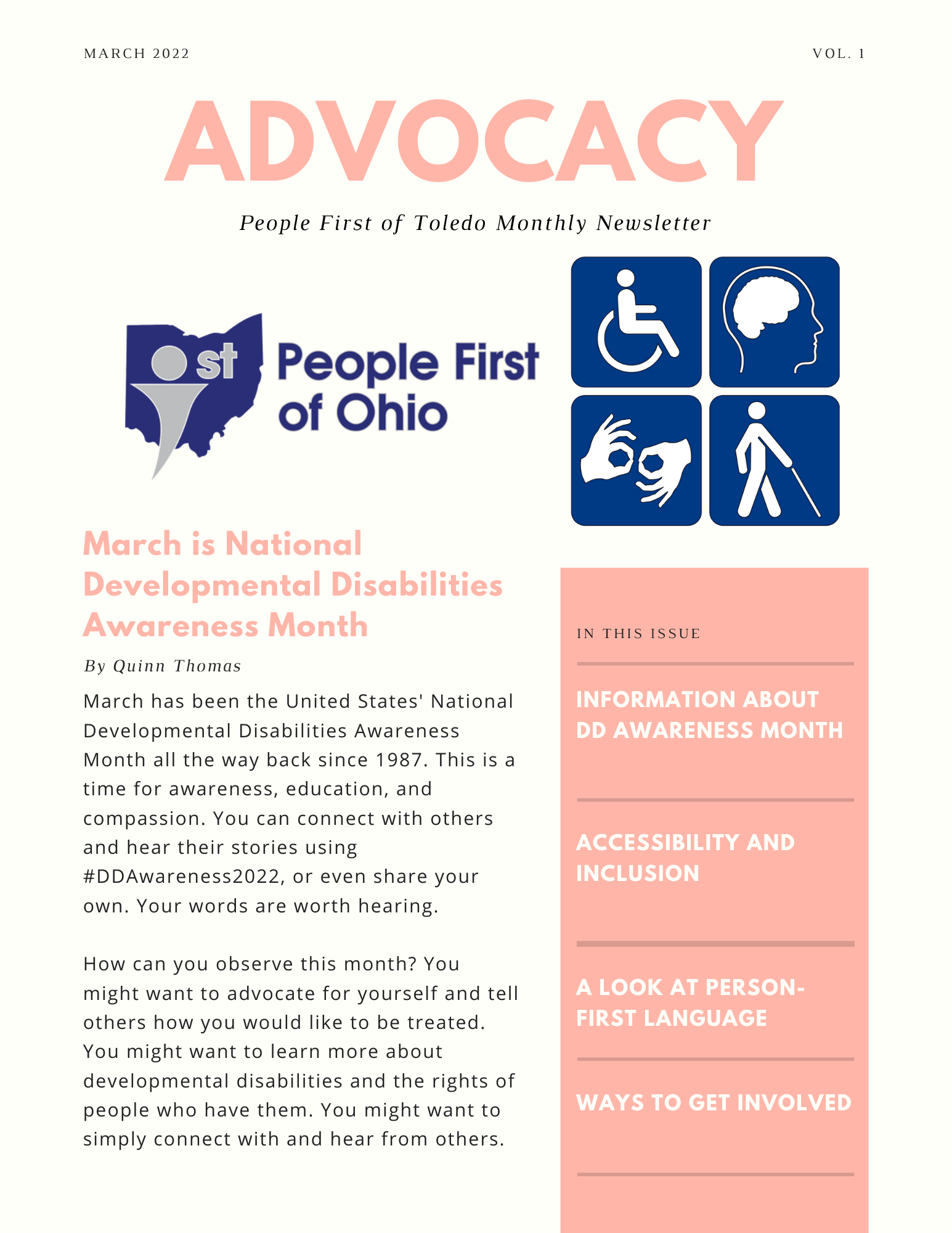 Advocacy Newsletter| Apr 1, 2022 March is National Developmental Disabilities Awareness Month This is People First of Toledo’s monthly advocacy newsletter. For a PDF version, click here. Sign up for emails. Previous Next Search for: Search Categories Advocacy Newsletter Blog Posts Camp Information Camp Updates Raffle
