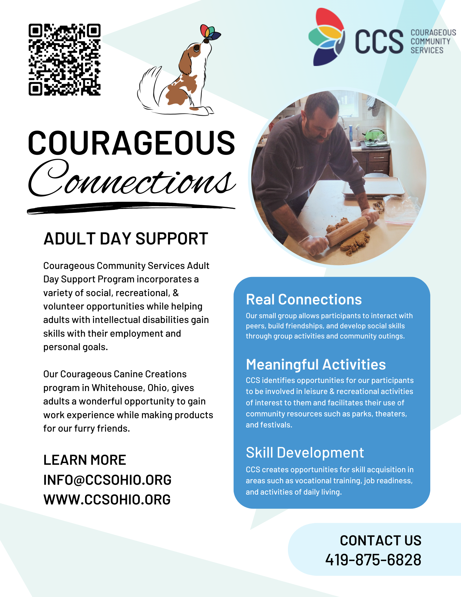 Our adult day support program is expanding! We are open to taking on new participants. Courageous Connections is an active, high-energy day program for adults looking to build up their job skills and make a difference in their communities. Activities include volunteering, regular outings, and a brand-new dog treat business.