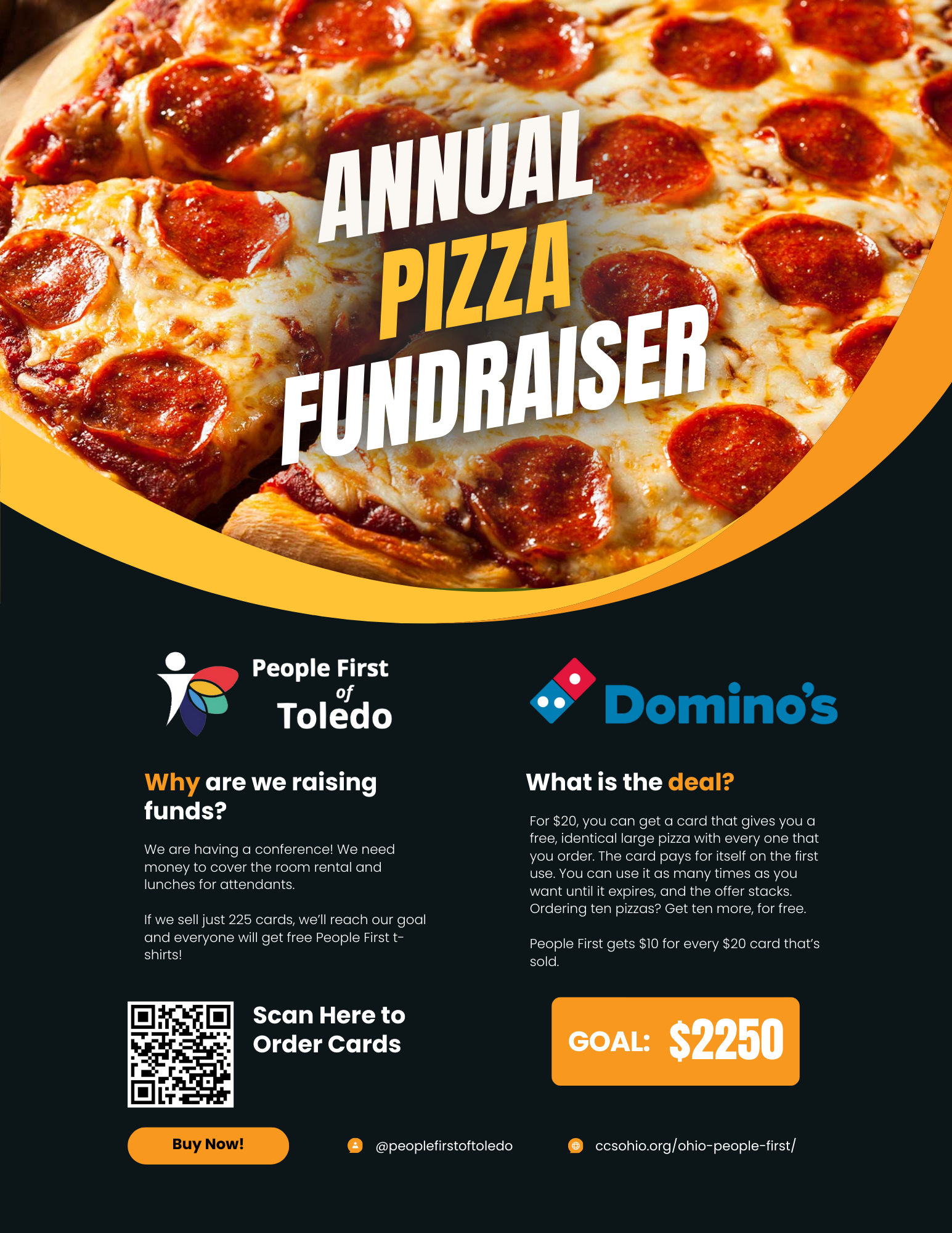 Our self-advocacy program, People First of Toledo, is doing the Domino’s pizza fundraiser! For just $20, you can get a card that gives you a free second large pizza with every large pizza you buy. Since that’s about the cost of one, the card pays for itself the first use. Ordering ten pizzas? Get ten more identical ones, free.